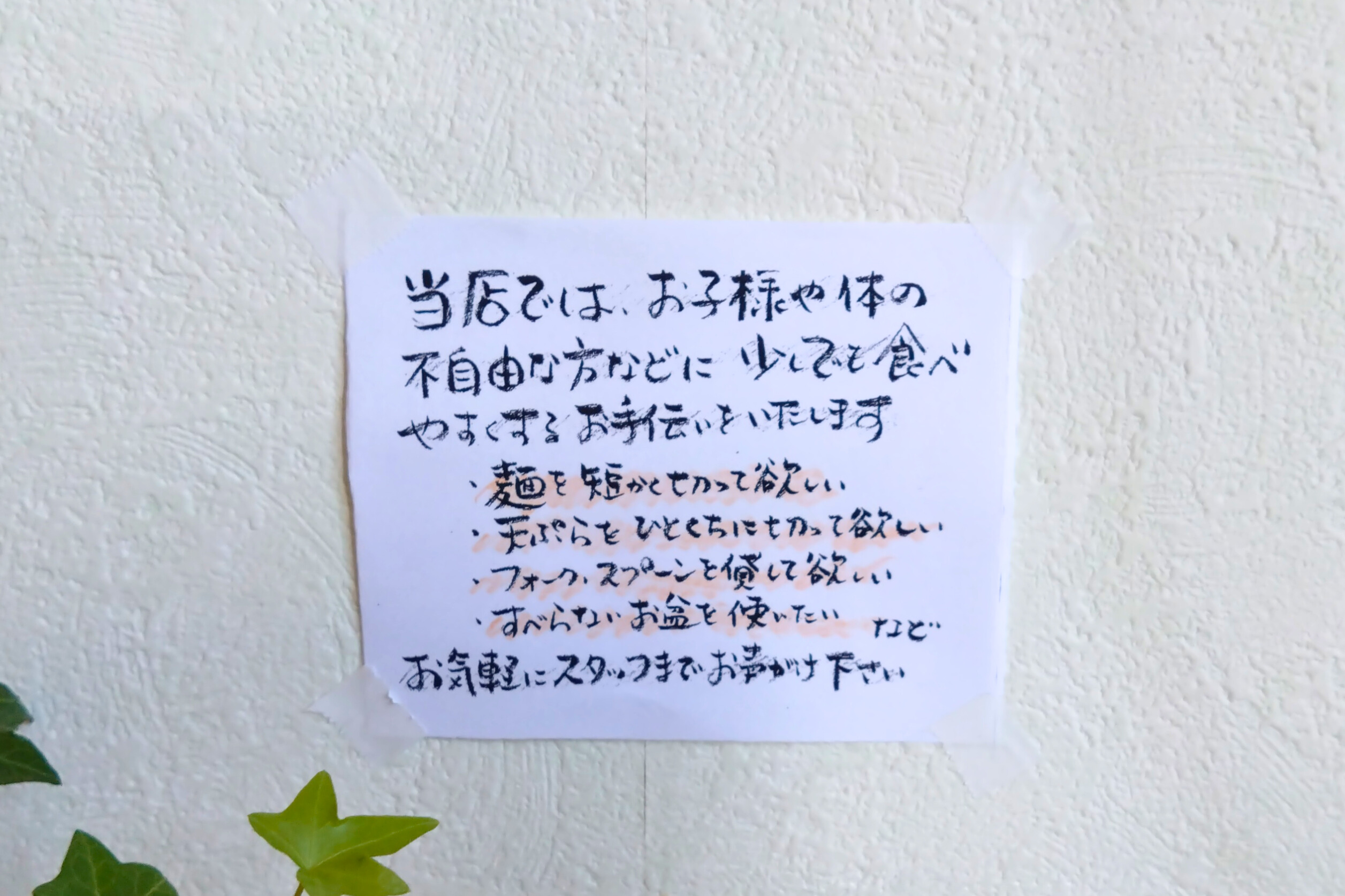 【施設よりひと言】 福祉施設に長い間従事していたため、きざみ食対応や必要であればスプーンやフォークの貸出なども可能です。お気軽にお声かけください。 発達障がいや身体障がいの方なども大歓迎です。お待ちしております。