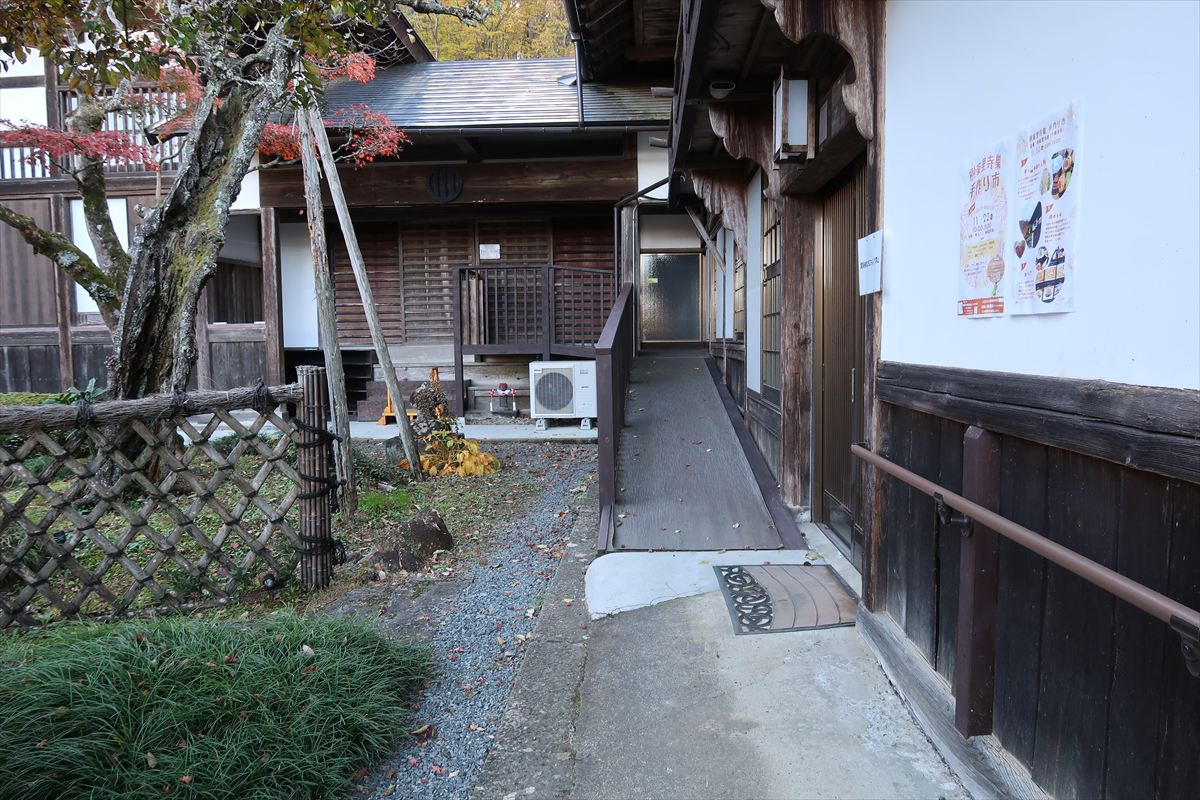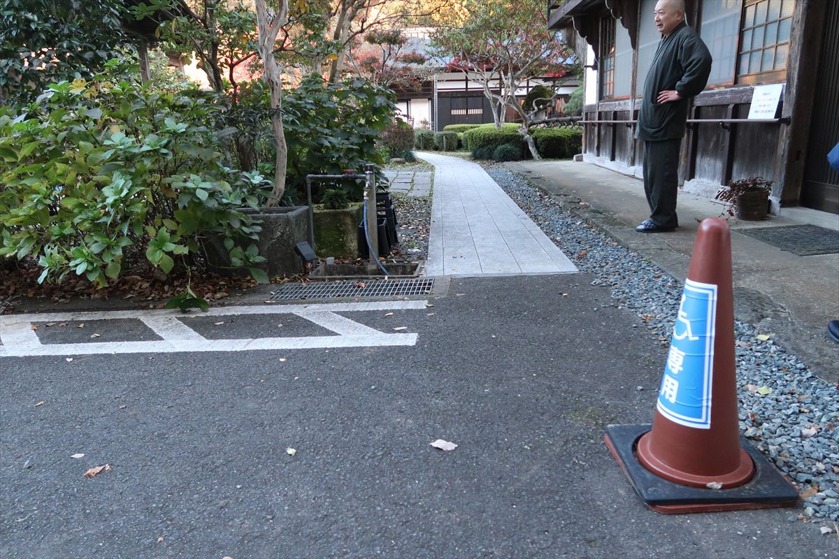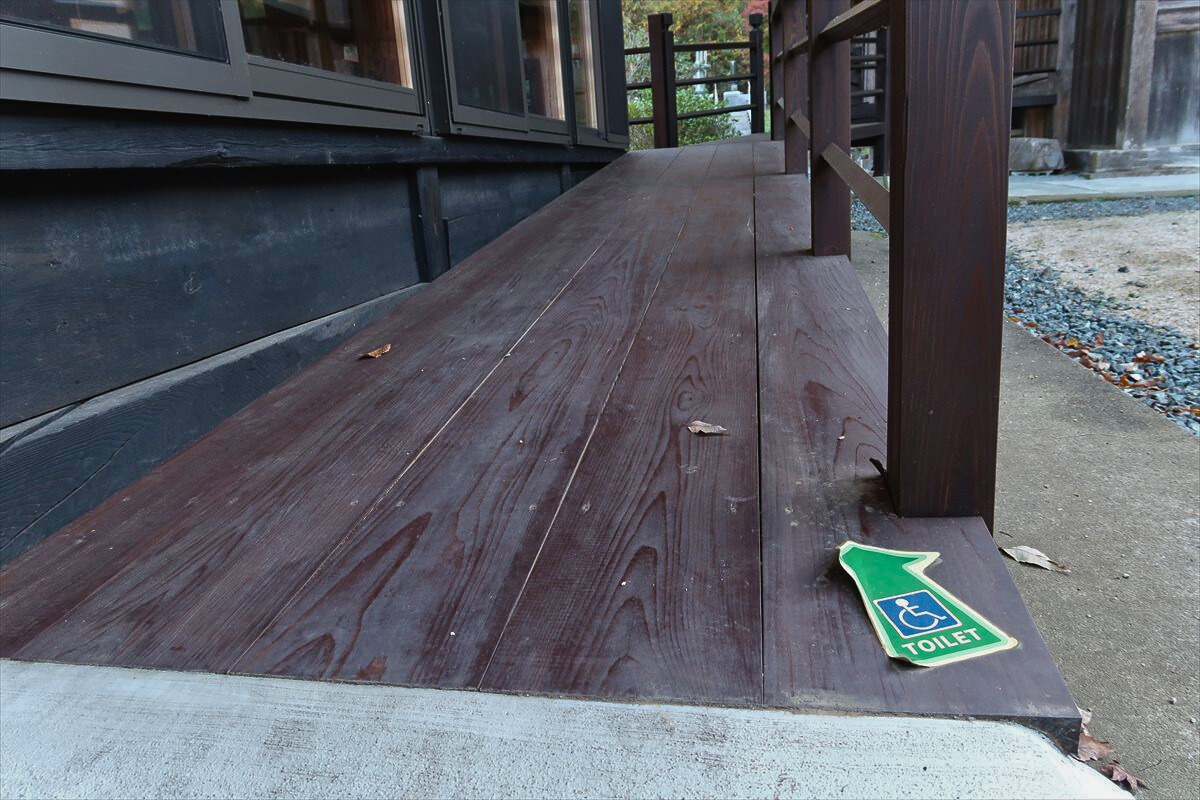 ・車いす利用者駐車場:本堂側に2台分あり ※杖歩行の方はおもいやり駐車場をご利用ください ・車いす対応トイレ:車いすご利用の方は、寺カフェ 樹楽里寺巣スロープ側入口にあるインターフォンで店員を呼び出しトイレのみの利用可能